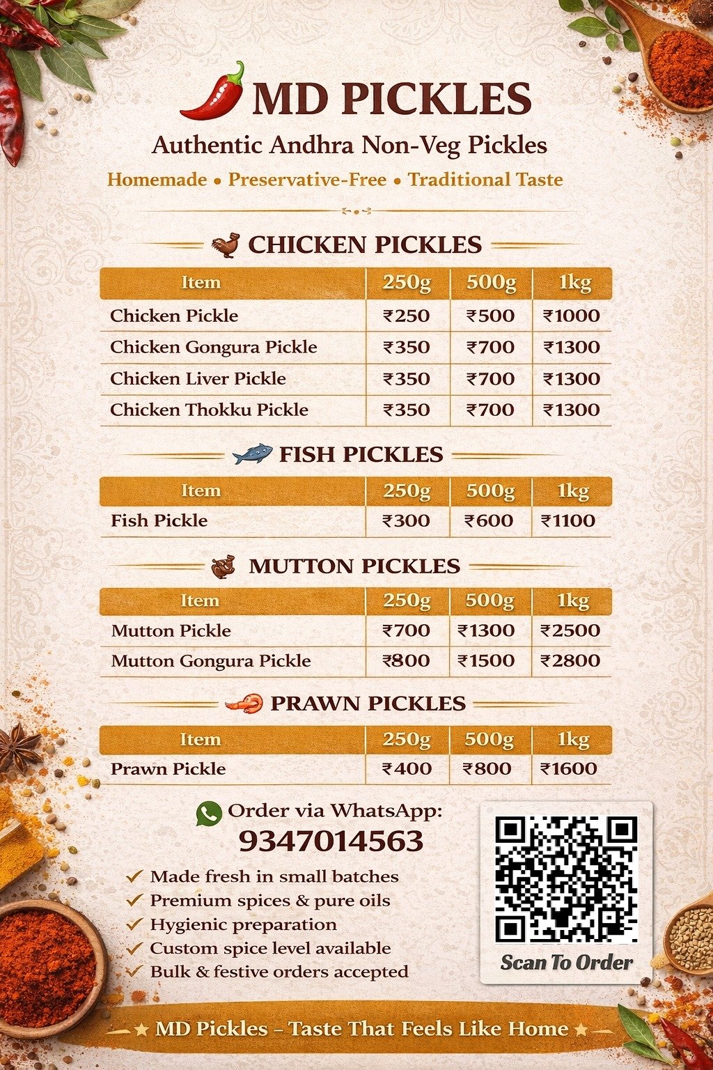 Bring home the authentic spicy taste of traditional non-veg pickles with MD Pickels.